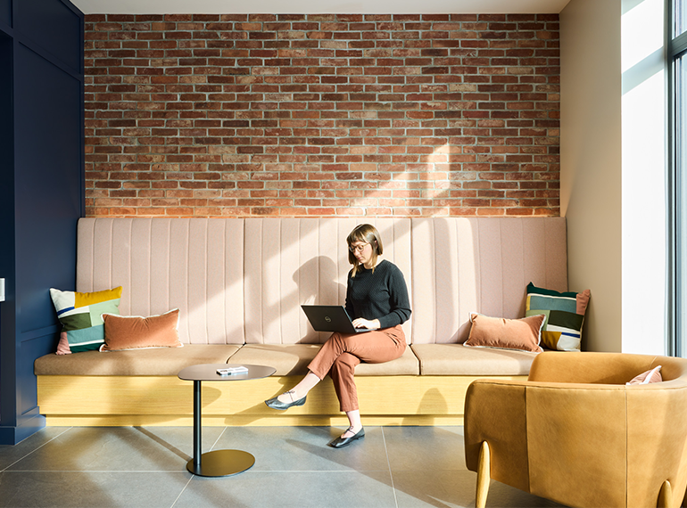 Art installations curated by global and local artists also add a gallery dimension of interest to the building’s interior with a lobby interactive display that interprets real-time air quality data from Cambridge.